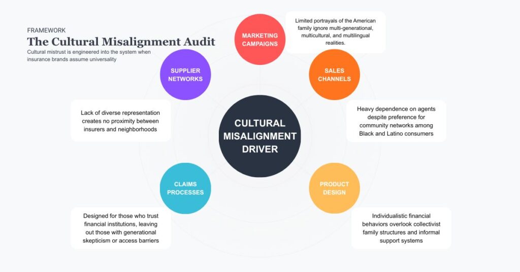 Cultural mistrust doesn’t appear out of thin air; it’s engineered into the system when insurance brands assume universality. Many marketing campaigns still rely on narrow portrayals of “the American family,” missing the multi-generational, multicultural, and multilingual reality that shapes much of the country. Sales channels often depend heavily on agents despite clear evidence that many communities– especially Black and Latino consumers– prefer to consult community networks, peer groups, or independent advisors instead.